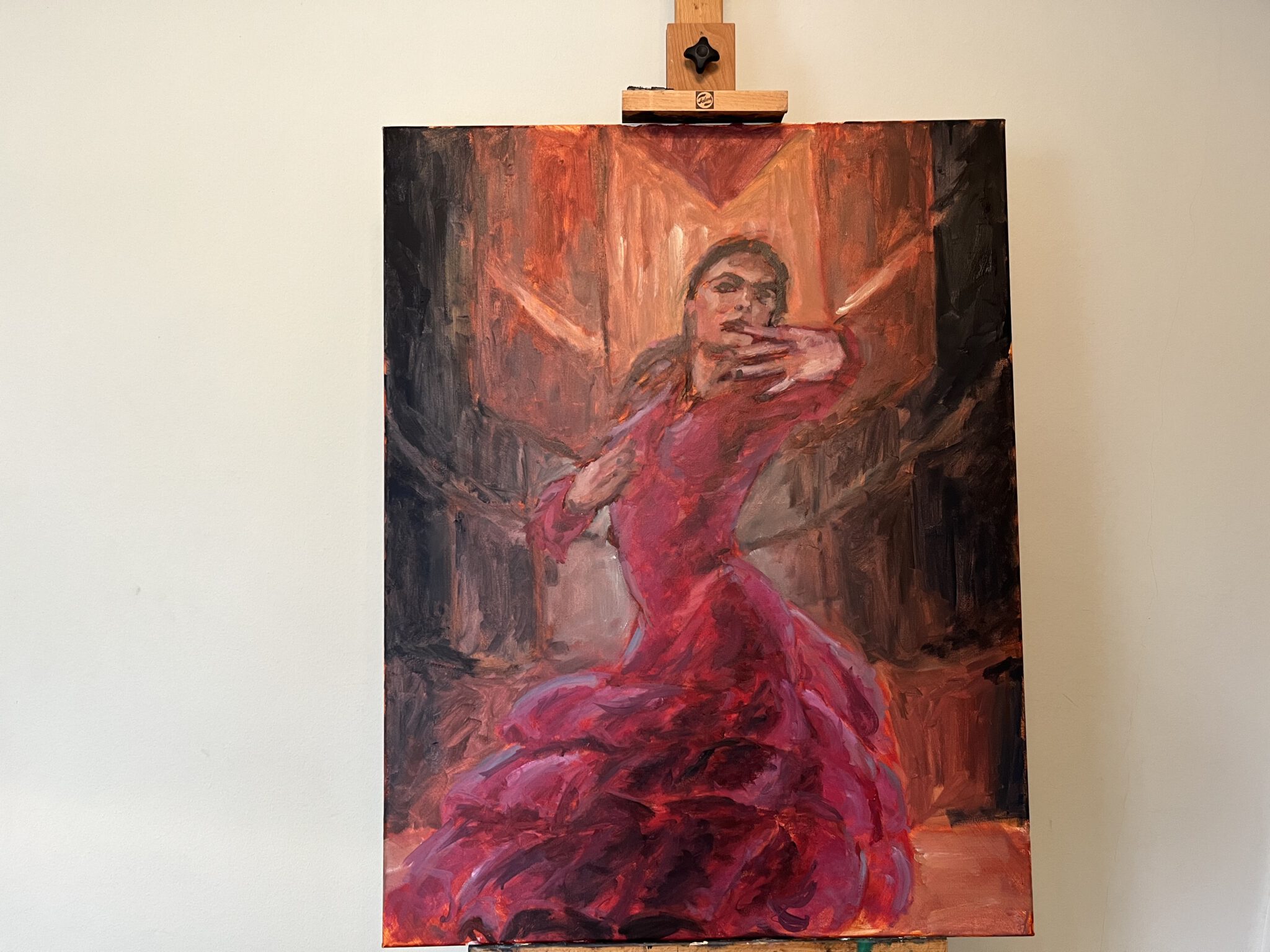 De leerlingen schilderen bewegende Flamenco danseressen na in de Stadsgehoorzaal in Leiden. Tijdens de duur van de opdracht staan er constant twee danseressen te dansen. Aan de leerlingen de taak om de dansbewegingen, maar ook het zwieren van de rokken zo goed mogelijk op het doek te krijgen.